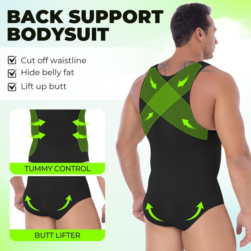 - MENS BODYSUIT SHAPE YOUR BODY: This mens shapewear bodysuit and body shaper slimmer that targets problem areas on the abdomen, chest, back and legs with high compression fabric, smooth your "man boobs" and beer belly, tighten your thighs, and flatten your bulges. It certainly slims the body once in and feels comfortable enough and giving you a newfound confidence by the slimming effect in appearance
