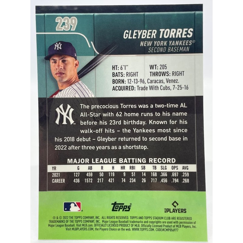 Gleyber Torres Baseball Card 2022 Topps Stadium Club Chrome #239