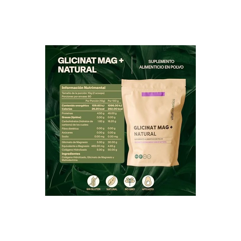 Glicinato de Magnesio en Polvo 600 gramos | Glicinato de Magnesio con Colágeno Hidrolizado puro | Suplemento Alimenticio | VITALBOTANICS (600 gramos, Sabor Natural)