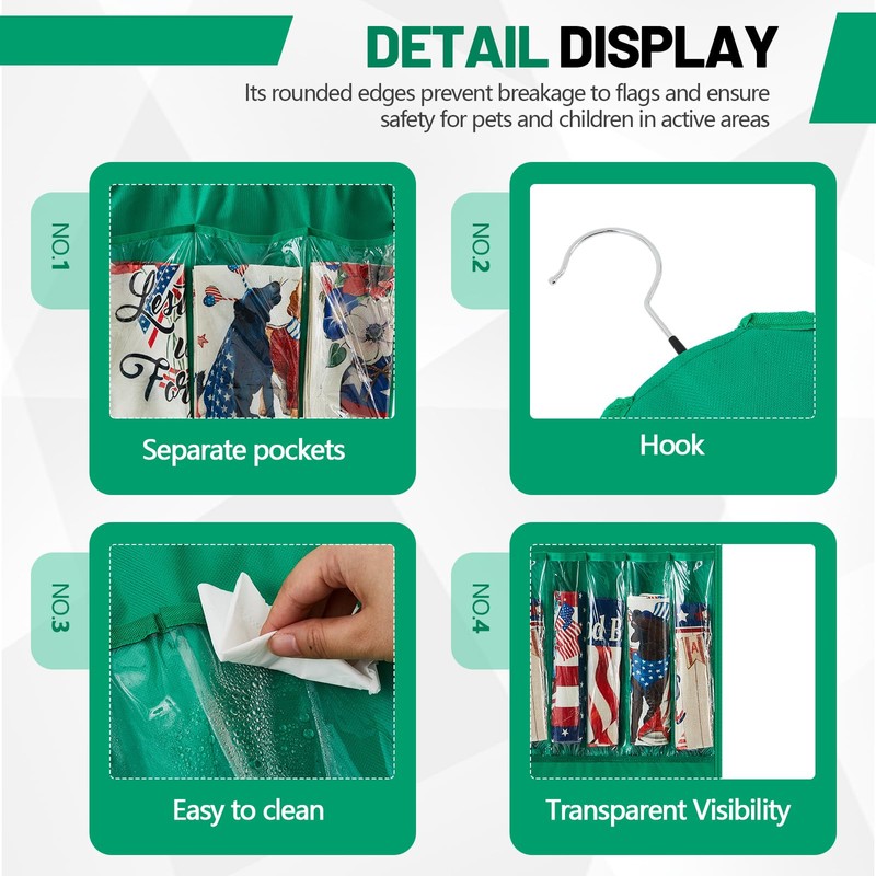 - Size and Versatile Storage: measuring about 18.5 x 48.3 inches, our garden flag storage organizer easily fits standard curtain or closet rods; It includes clear pockets for easy organization, accommodating up to 21 decorative garden flags and 9 house flags, this makes it the nice solution for comprehensive and efficient flag storage