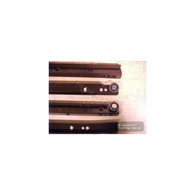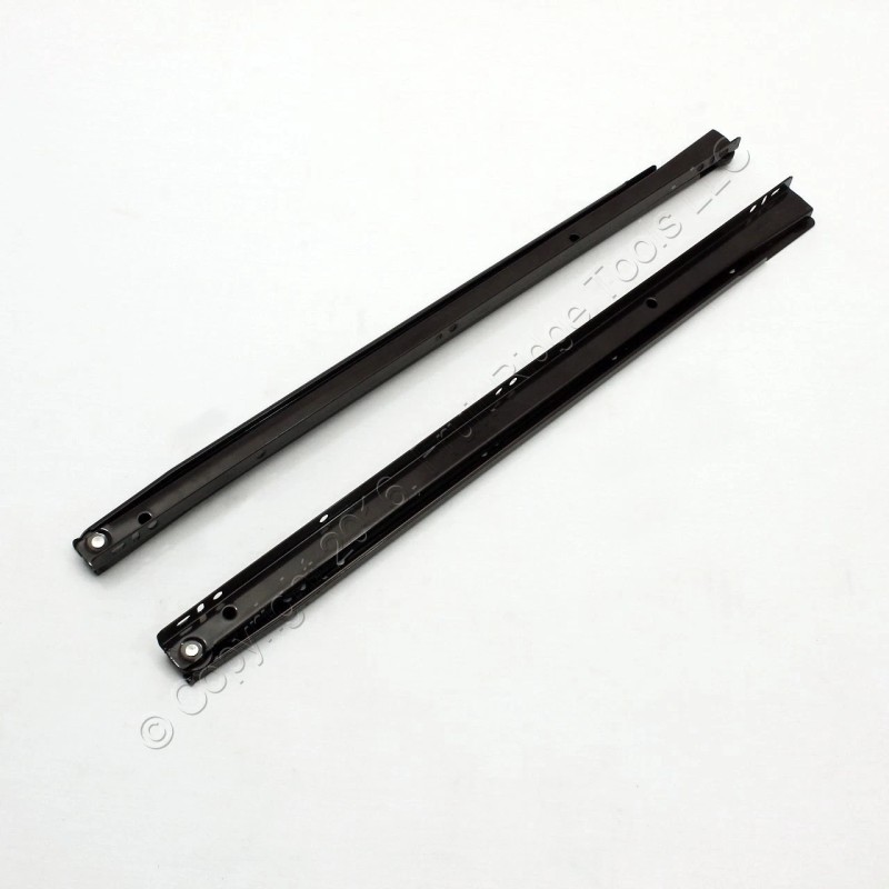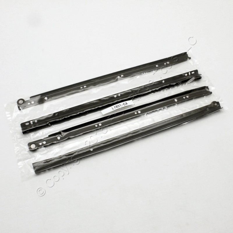 ONE Pair GlideRite Hardware 80 lb. low-profile drawer slides. (1 pair is needed for 1 drawer and each pair is made up of 4 parts) Side-mounted, smooth action, Delrin wheels. These 3/4 extension drawer slides are among the quietest, smoothest and lowest profile slides on the market. An ideal choice for face frame cabinets, the slides are made from heavy gauge steel coated with easy-to-clean epoxy for maximum convenience and durability. The brown finish blends in well with a variety of wood species. Ideal use is in office furniture, cabinets, closets, kitchens and medical furniture. Meets or exceeds all BIFMA, BHMA and ANSI standards for quality. They measure 18" long and 1/2" thick with 9-1/2" total travel. Features include: