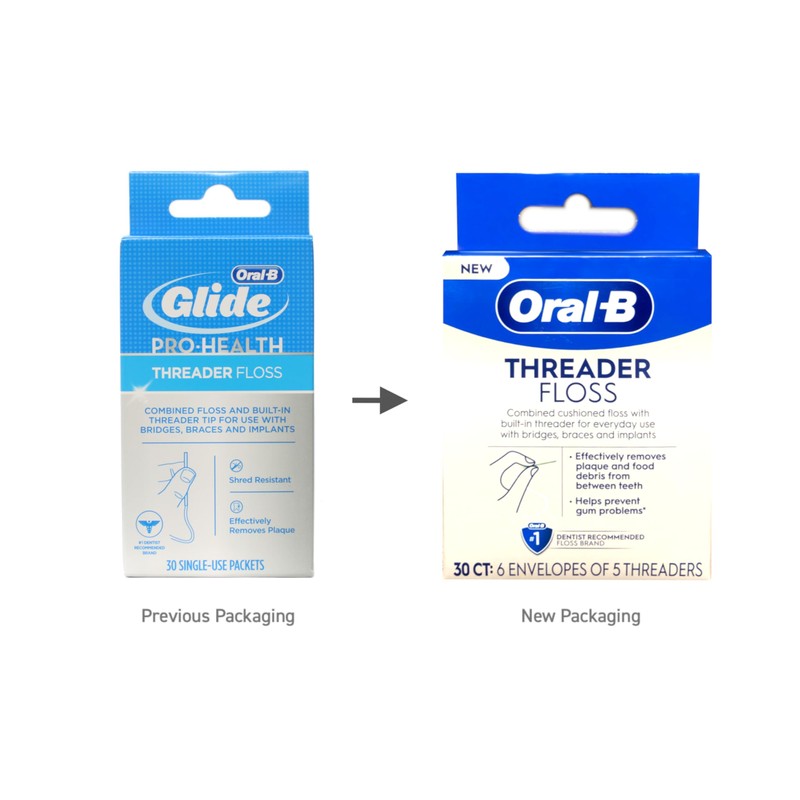 Oral-B Glide Pro-Health Threader Floss combines floss and a built-in threader ideal for use with bridges, braces, and implants. It effectively removes tough plaque between teeth and just below the gum line.