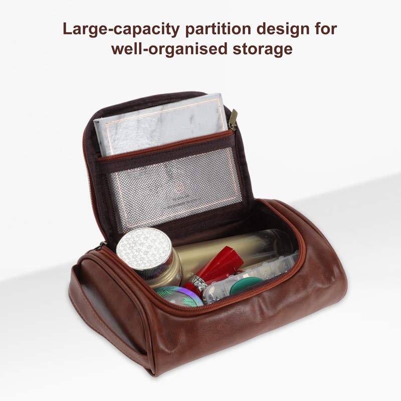 - Elegant PU Leather: Indulge in the luxurious feel of this travel toiletry bag, meticulously crafted from premium PU leather. The material not only exudes elegance but also offers water-resistant and dirt-repelling properties, ensuring easy cleaning and maintaining a sophisticated appearance.