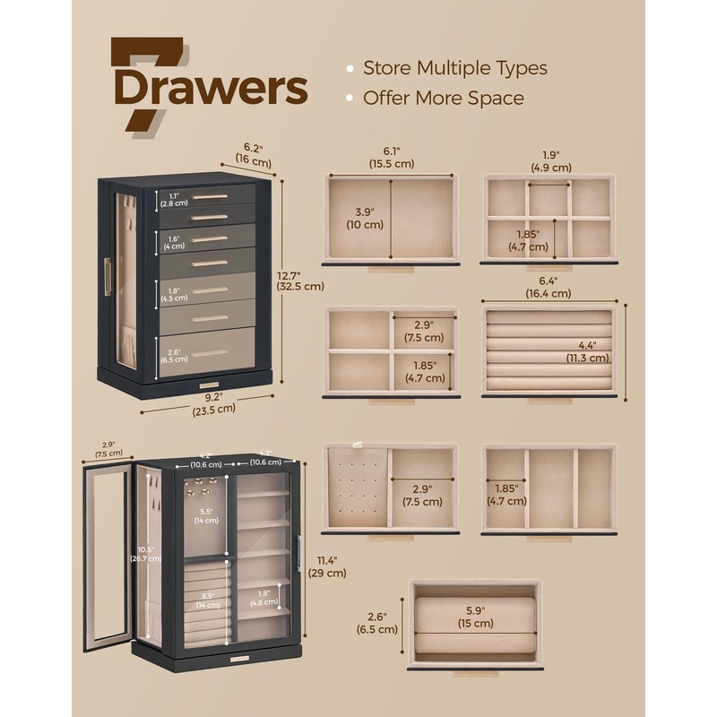 - 【Spacious Storage for All Jewelry Types】This jewelry box has everything you need for organized storage. It includes ring slots, earring holes, long necklace hooks, bracelet hooks, watch cushion, and 7 drawers–perfect for keeping earrings, rings, brooches, hair accessories, watches, and more neatly stored. Measuring 6.2"x9.2"x12.7".