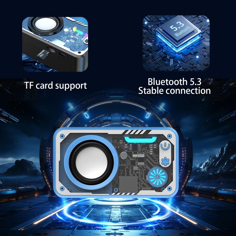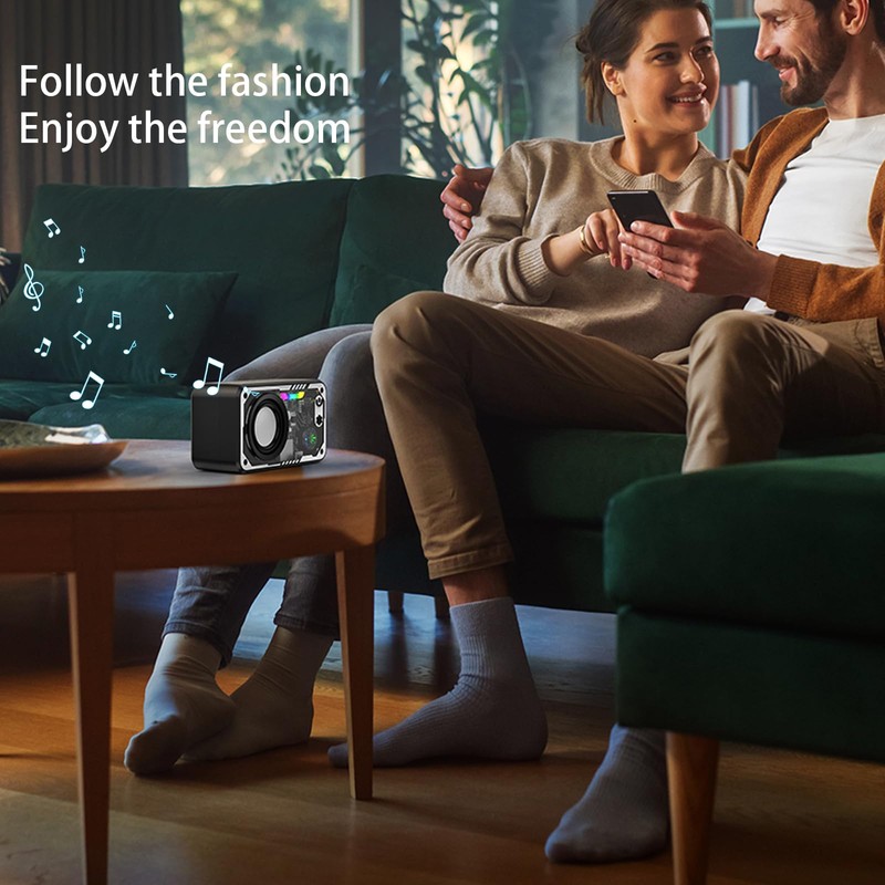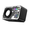 - Sleek Design: Featuring a unique transparent casing, this speaker showcases its internal components in a modern, eye-catching style. RGB light effects for ingenious combination of sound and visuals, bring both visual and auditory enjoyment