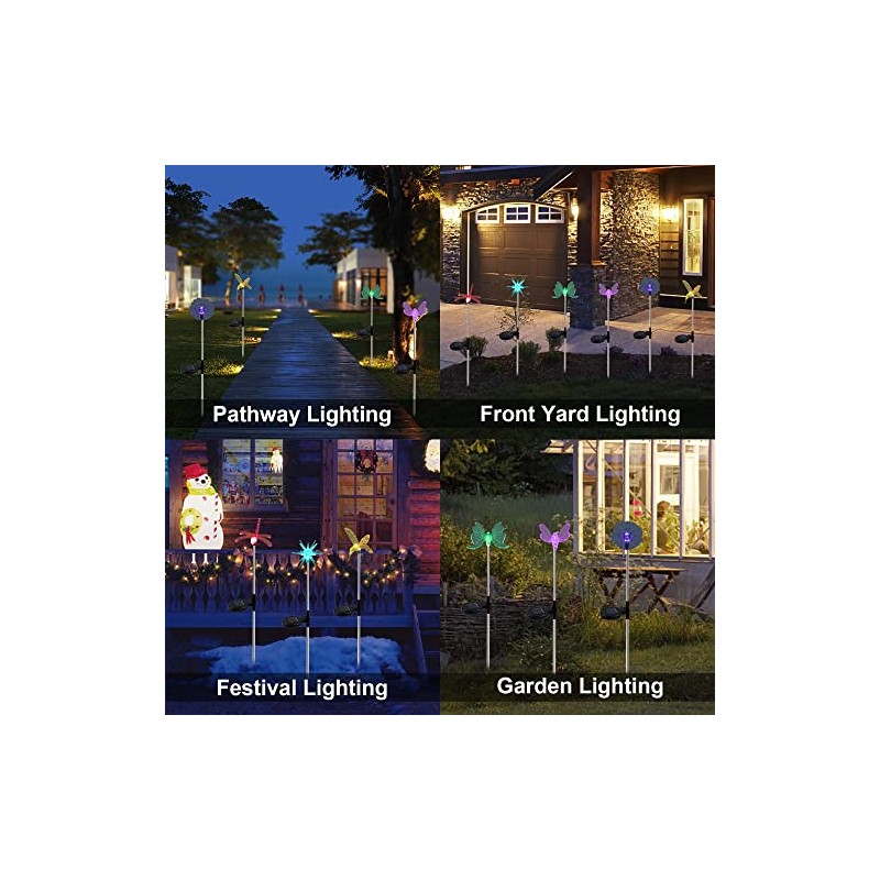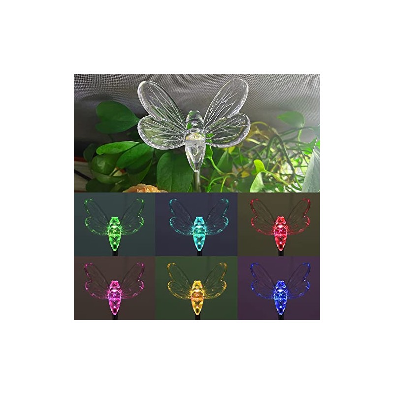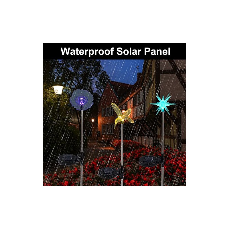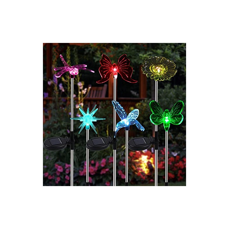 Our 6 pack delicate solar garden lights with vivid clear figurines of butterfly, dragonfly, hummingbird, bee, star, and sunflower embellishes your garden, solar decorative lighting ensures a great effect when the lamp glows colorful lights in the dark.
