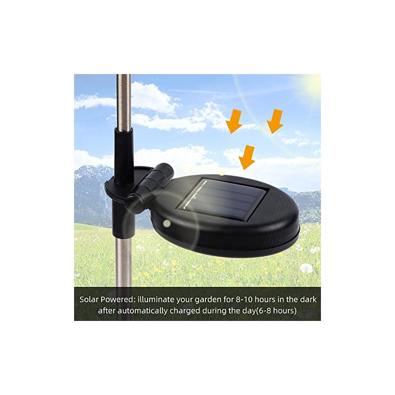 - ASSEMBLE EASILY: Complete with detailed instructions. These solar garden lights can be done in a few minutes. Just connect the stainless steel parts and stake into the soft ground where there has direct sunlight. In stormy weather, please keep the solar lights indoor to avoid damaging the solar panels.