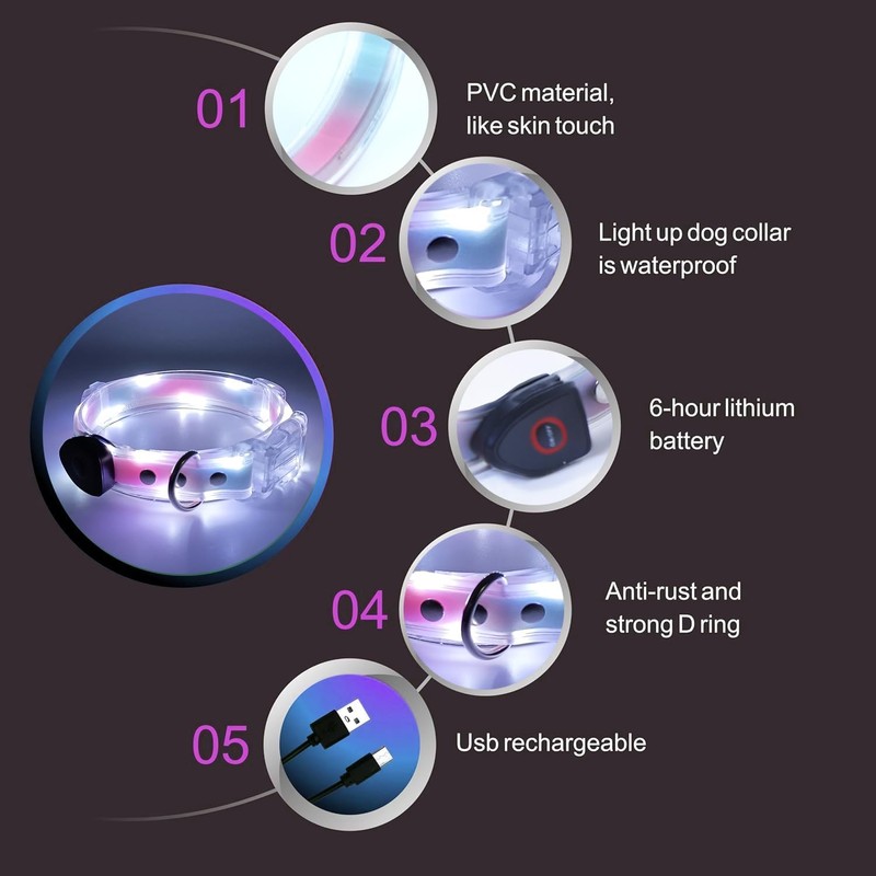 Dog Collar: Long light, slow flash, fast flash, 3 colorful light source modes, these only need a button to easily control. your dog safely avoids cars and pedestrians at night, while quickly finding your dog in the dark outdoors.1,000 feet of visibility ,prevent dangerous animals such as coyotes from approaching.WATERPROOF CONSTRUCTION: Made of high quality PVC and nylon material,the new PVC coated is more waterproof and dirt-resistant than other led dog collar. it is easy get dirty outdoor,you only need to wipe it with a paper towel or soft cloth .soft collar makes it more comfortable for your dog to wear and reduces stress on their neck, without scratching or irritating your dog's skin.Rechargeable Collar: the dog collar provides up to 6 hours of light for your dog on a single charge,It can be charged from any device via any micro USB cable .the battery is splash water and rain proof, but cannot be immersed in water for a long time.Adjustable Size: Light up dog collars comes in sizes for small medium large dog and is adjustable, so there's no need to worry about finding the right collar for your friend.the alloy D ring is rust-proof and fashion.After-sales service: This Adjustable Dog Collar Very Comfortable for Your Dogs to Wear It on Their Necks.If you are not satisfied with the waterproof design LED dog collar, please contact us directly,We Will try Our Best to Satisfy You.
