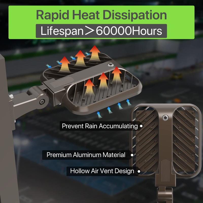 - Solid and Durable. This area security light consists of quality aluminum housing, high-efficiency driver, thick cooling fins, and hollow air flow design. These features contribute to excellent heat dissipation, allowing the light to have a lifespan of up to 60,000 hours.
