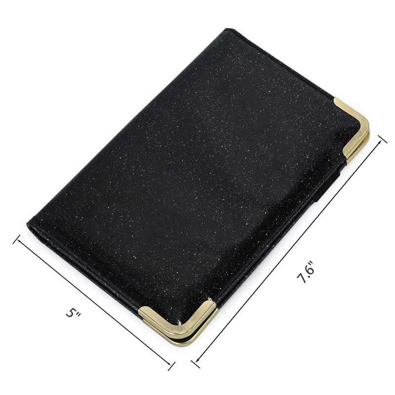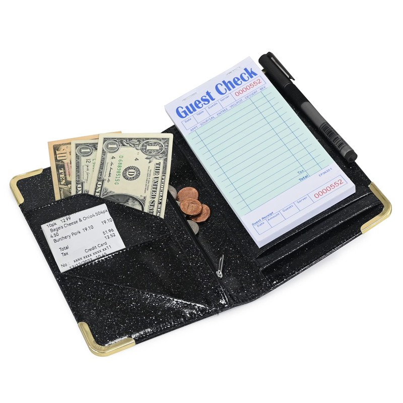 - Size: Glitter black server book with a zipper pocket, measuring 5" x 7.6". This moderate size fits perfectly with restaurant checks and easily slips into the pocket of an apron
