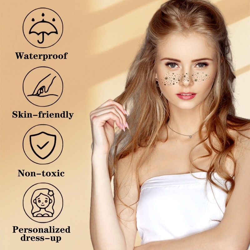 - Sparkling :Our Silver/golden Glitter Freckles Face Tattoos add a stunning, eye-catching sparkle to your makeup, making you the center of attention wherever you go.