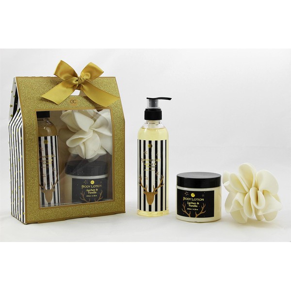 Glitter Gift Box Shower Gel Body Lotion Bath Set & Sponge – Lychee & Vanilla