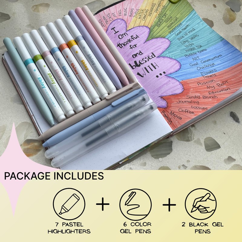 - ✔ 【All-in-One Writing Kit for Everyday Use】This 15-piece pen set includes 7 glitter pastel highlighters, 6 Morandi color gel pens (0.5mm), and 2 waterproof black gel pens (0.5mm) – perfect for school note-taking, exam prep, Bible study, planning, journaling, and more.