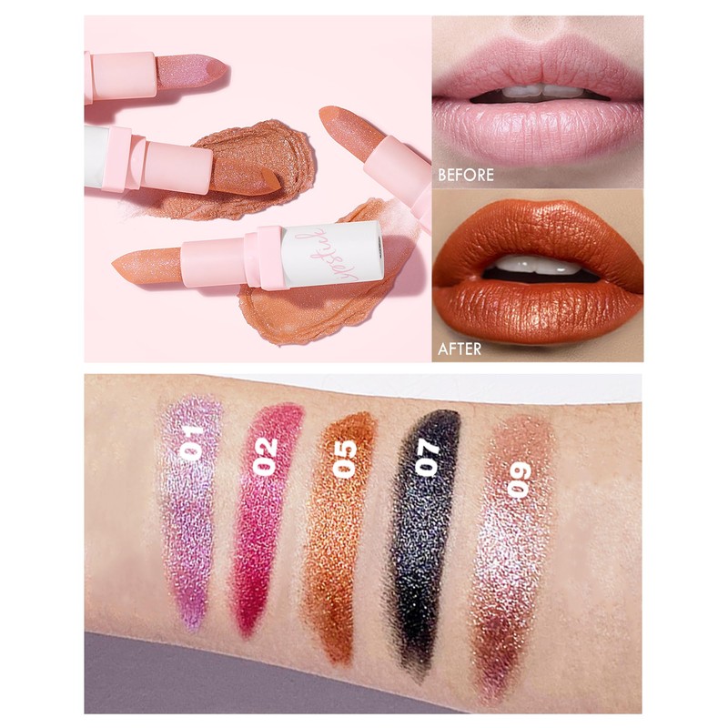 - Glitter Metallic Lipstick Lip Color - High pigment matte lipstick comes in 5 bold colors, each color with diamond shimmer glitter that meet your any occasion makeup need. Tinted lip balm fully provide color to the lips without forgetting to moisturize the lips. Choose our lip product, provide you the nourish sparkling and 3 dimensional effect glitter lip makeup.