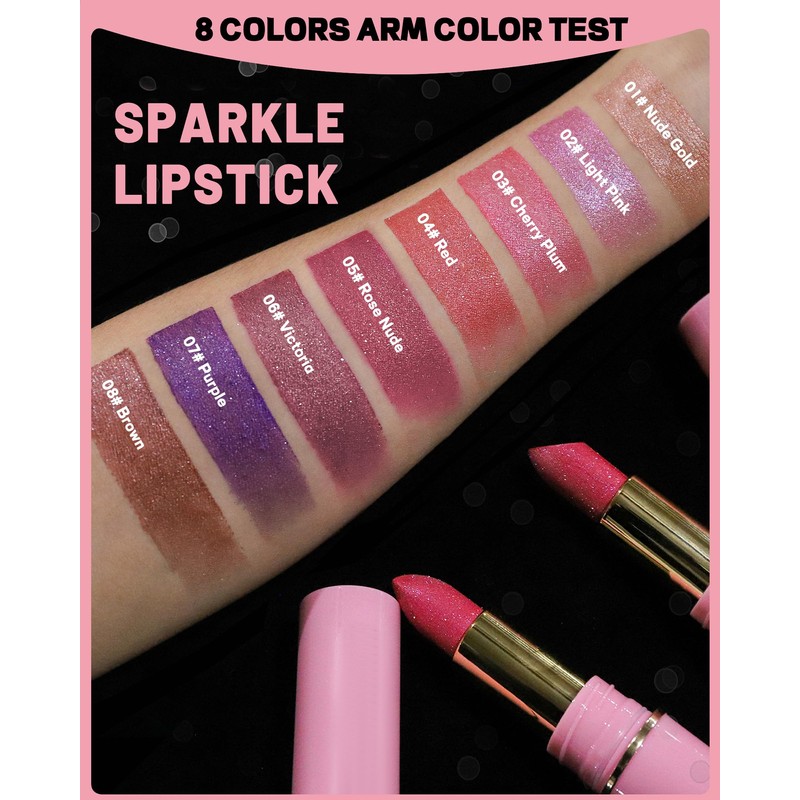 • Shimmer Metallic Lipstick - Glitter metallic lip stick is a moisturizing lipstick infused with shimmering sparkles combined with high pigments, provides bright and dazzling luster, and keeps you bright, waterproof and moisturizing all day long. It comes in 8 bold colors, each color with diamond shimmer glitter that meet your any occasion makeup need. A light application creates a subtle radiant lip look, while a thicker application showcases a metallic sheen.