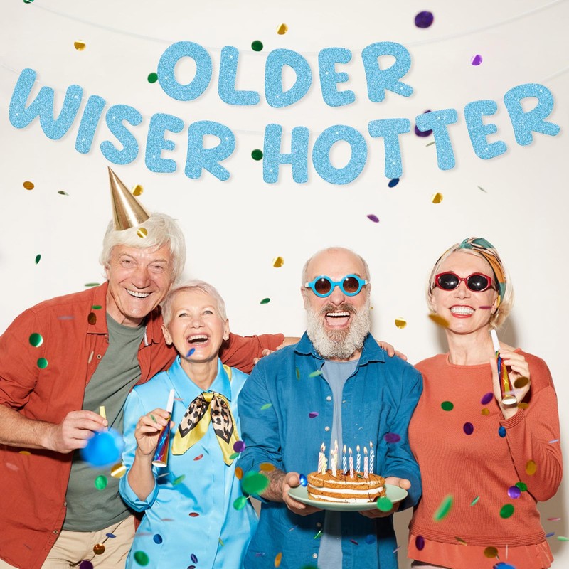 - What You Will Get: Our sky blue glitter Older Wiser Hotter banner package contains "Older Wiser Hotter" alphabet cards, 3 rolls of five-meter ribbon and 1 threading device.