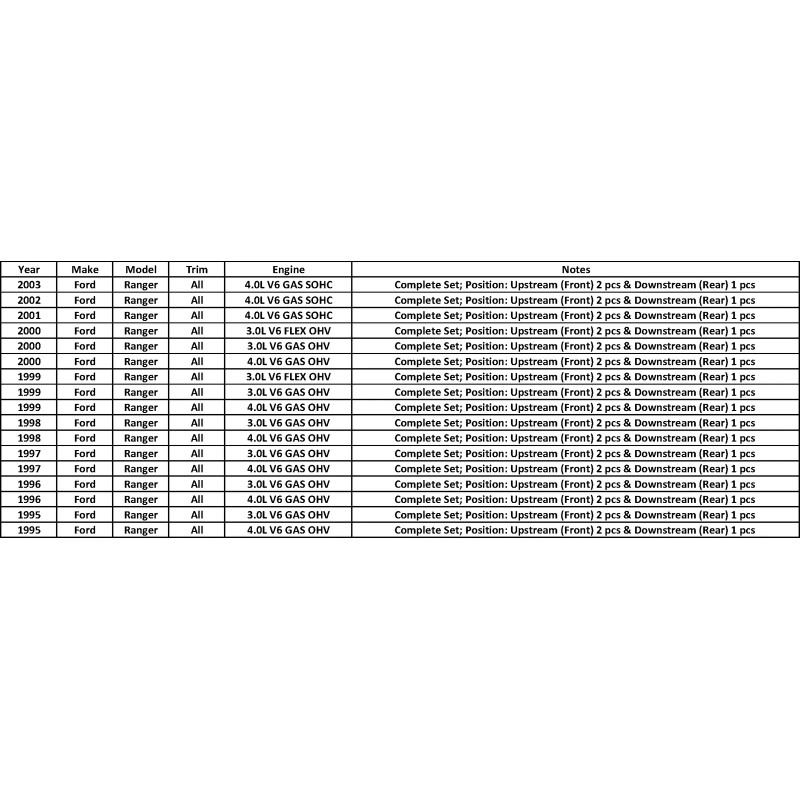 2003 Ford Ranger All 4.0L V6 GAS SOHC Complete Set; Position: Upstream (Front) 2 pcs & Downstream (Rear) 1 pcs