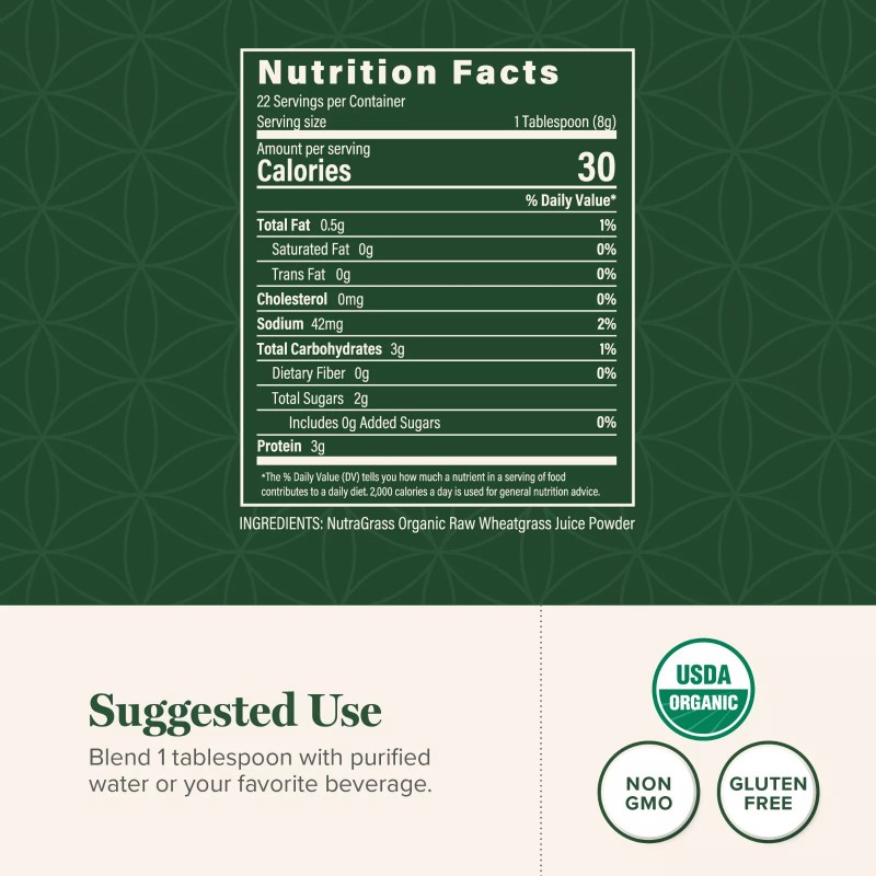 NutraGrass™, our source for young wheatgrass sprouts, is uniquely potent in chlorophyll, amino acids, vitamins, and minerals. A daily dose of an Organic Wheatgrass supplement delivers powerful micronutrients essential for reducing oxidative stress, detoxifying the body, boosting energy, and supporting immune function. The vibrant green color, invigorating “green” aroma, and fresh flavor make a scoop of Organic Wheatgrass a simple and harmonious addition to your daily wellness routine.