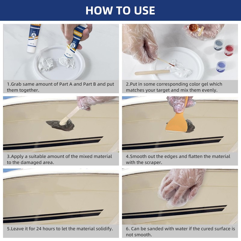 - Multifunctional Marine Fiberglass Repair Kit: It is suitable for repairing chips, cracks, pits, gouges, scratches and holes on various watercraft such as jet skis, canoes, kayaks, sailboats, speedboats, yachts, dinghies, surfboards and decks, keeping the vessels in good condition.