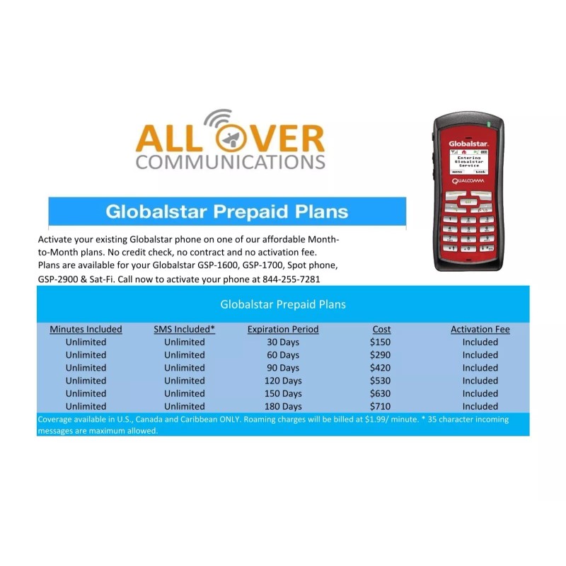 Fast activation now only $14.99 available for any Globalstar GSP-1600, GSP-1700, Sat-FI, or Spot phone within one hour of purchasing (during hours of 8 AM - 6PM PST). Please provide contact # for us to call for quick over the phone activation. Monthly and annual service plans available. FREE GSP-1700s also available when activating on select annual Globalstar airtime plans. Annual plans provide an exceptional value for seasonal use.