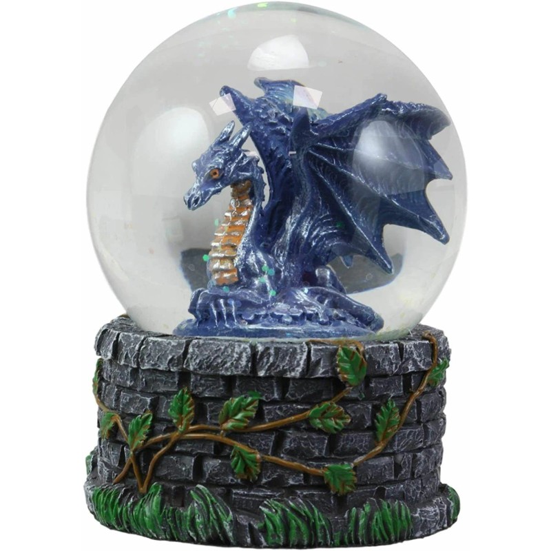 • Are you looking for a unique gift or a collectible for yourself? This water globe is a nice candidate for you! It show cases a mysterious blue dragon sitting in repose within the glass atmospheric dome. The glass sphere globe rests on a stonewall laid castle tower structure, giving the water globe a medieval Old World fantasy feel.