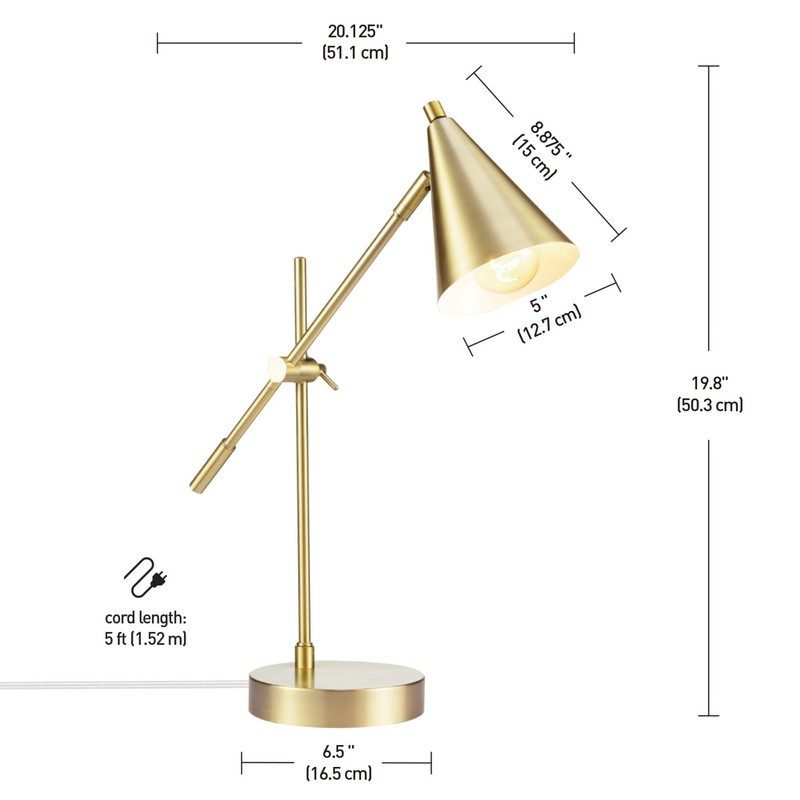 The Tacoma Desk Lamp from Novogratz x Globe Electric offers a task light in a clean tidy package with a trendy cone shape shade and a stylish matte brass finish. The adjustable brass balance arm and tilting lamp head lets you direct the light where you need it most while creating ideal lighting ambiance for any situation. The sculptural design adds a modern touch to your office, bedroom or living room and acts as the statement piece to tie your interior design together. Decorate with the Novogratz and Globe Electric - lighting made easy.