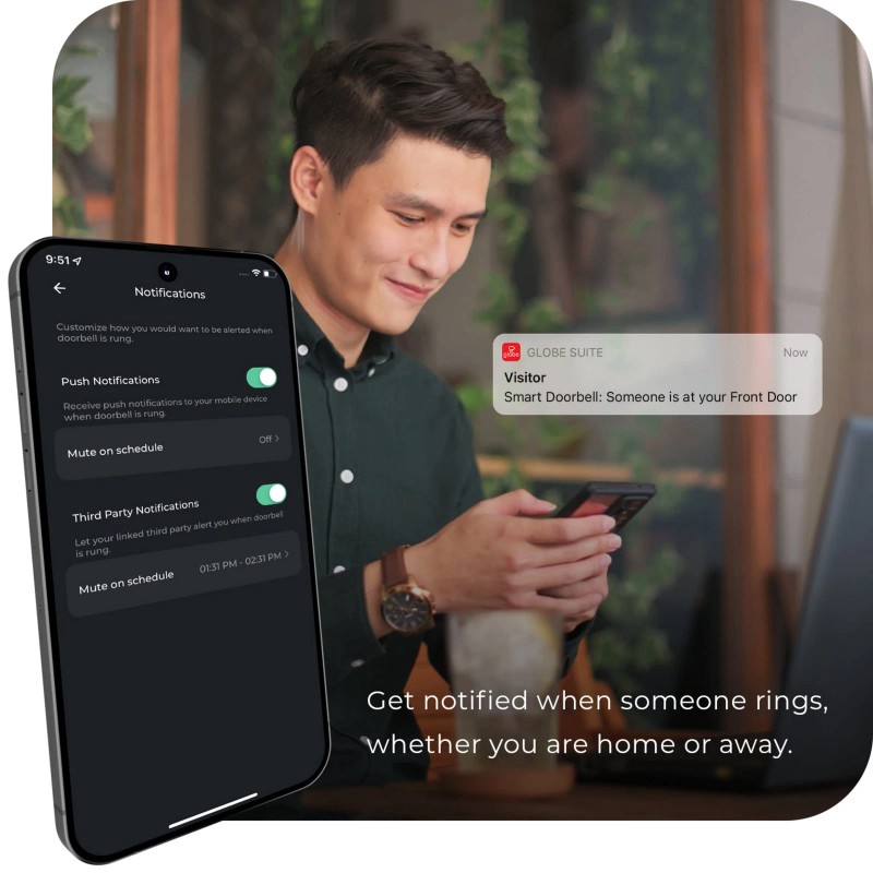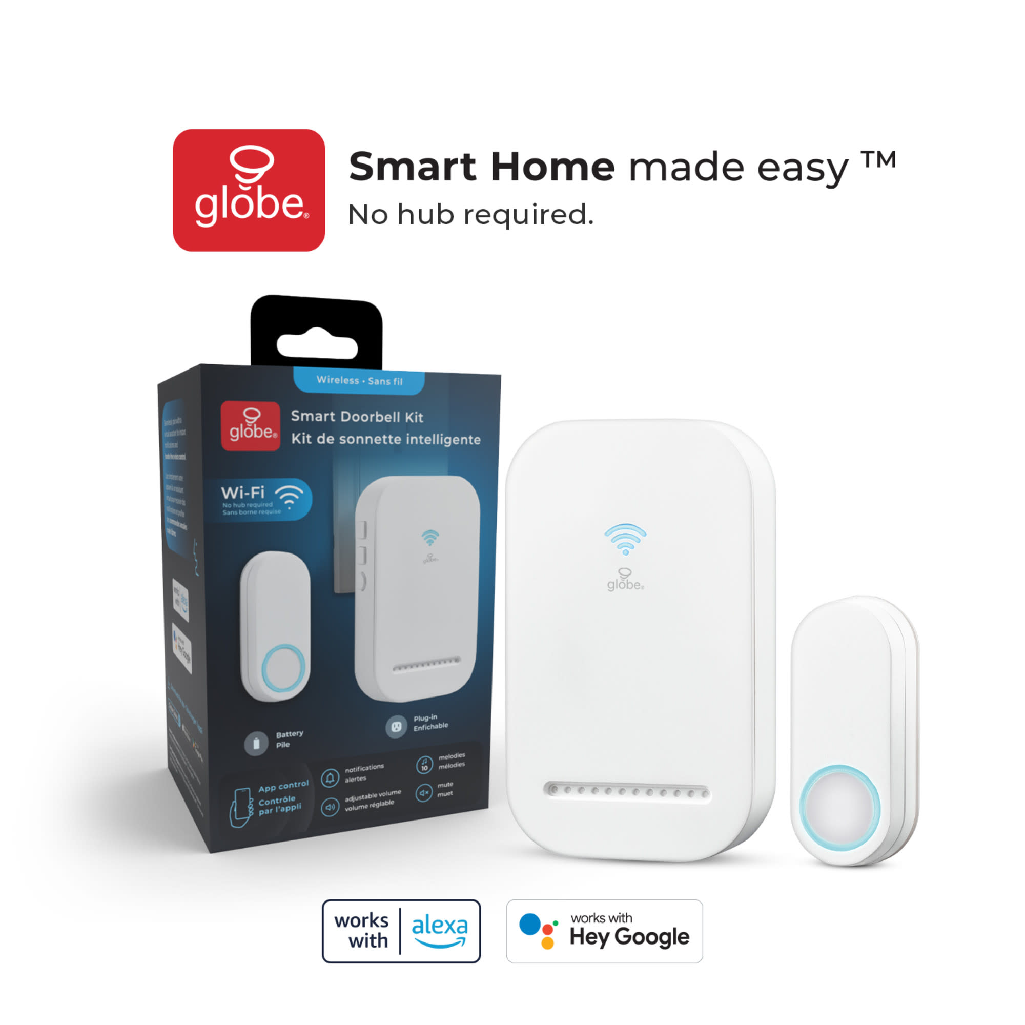 - No hub required, simply download the Globe Suite app, connect to your home Wi-Fi, and sync your doorbell