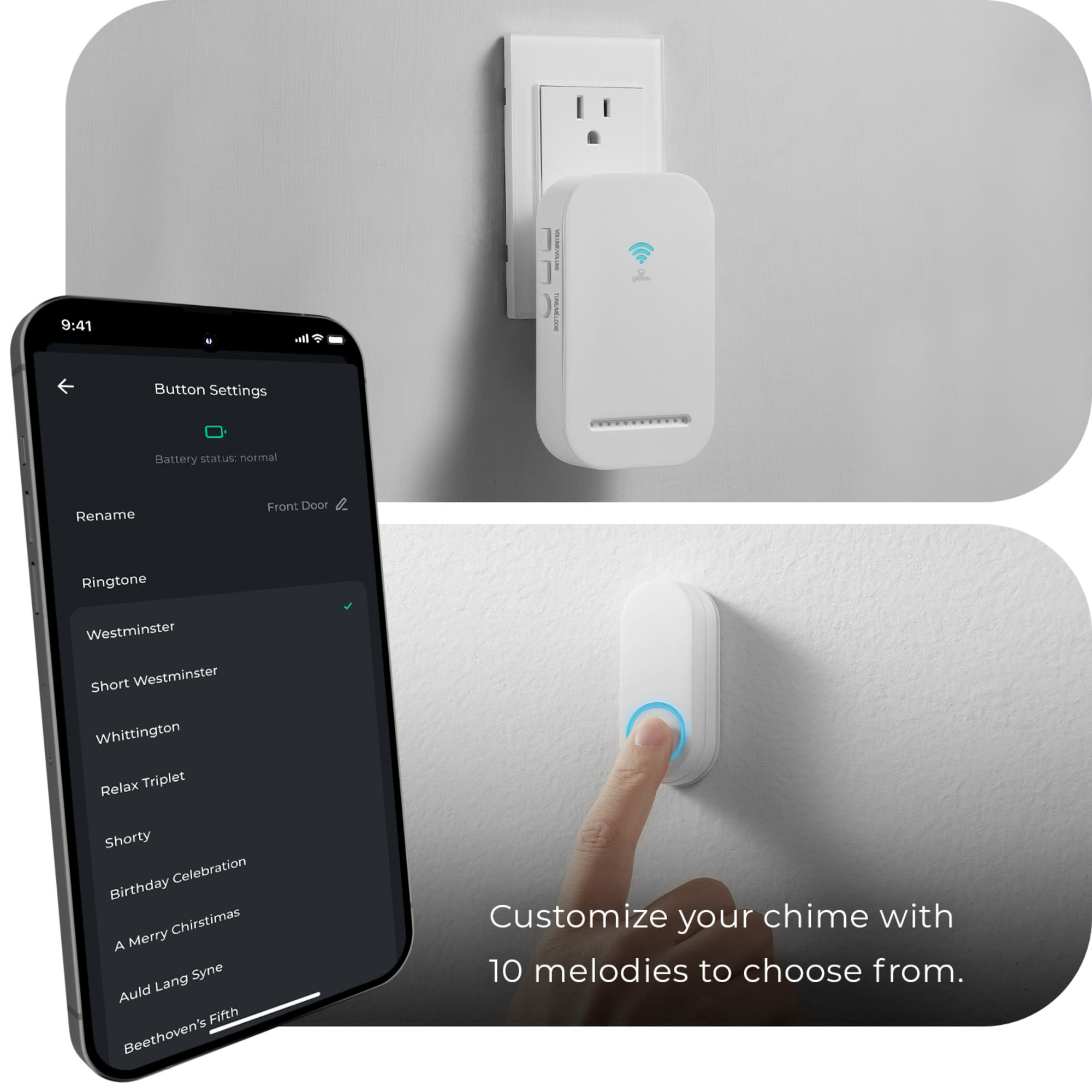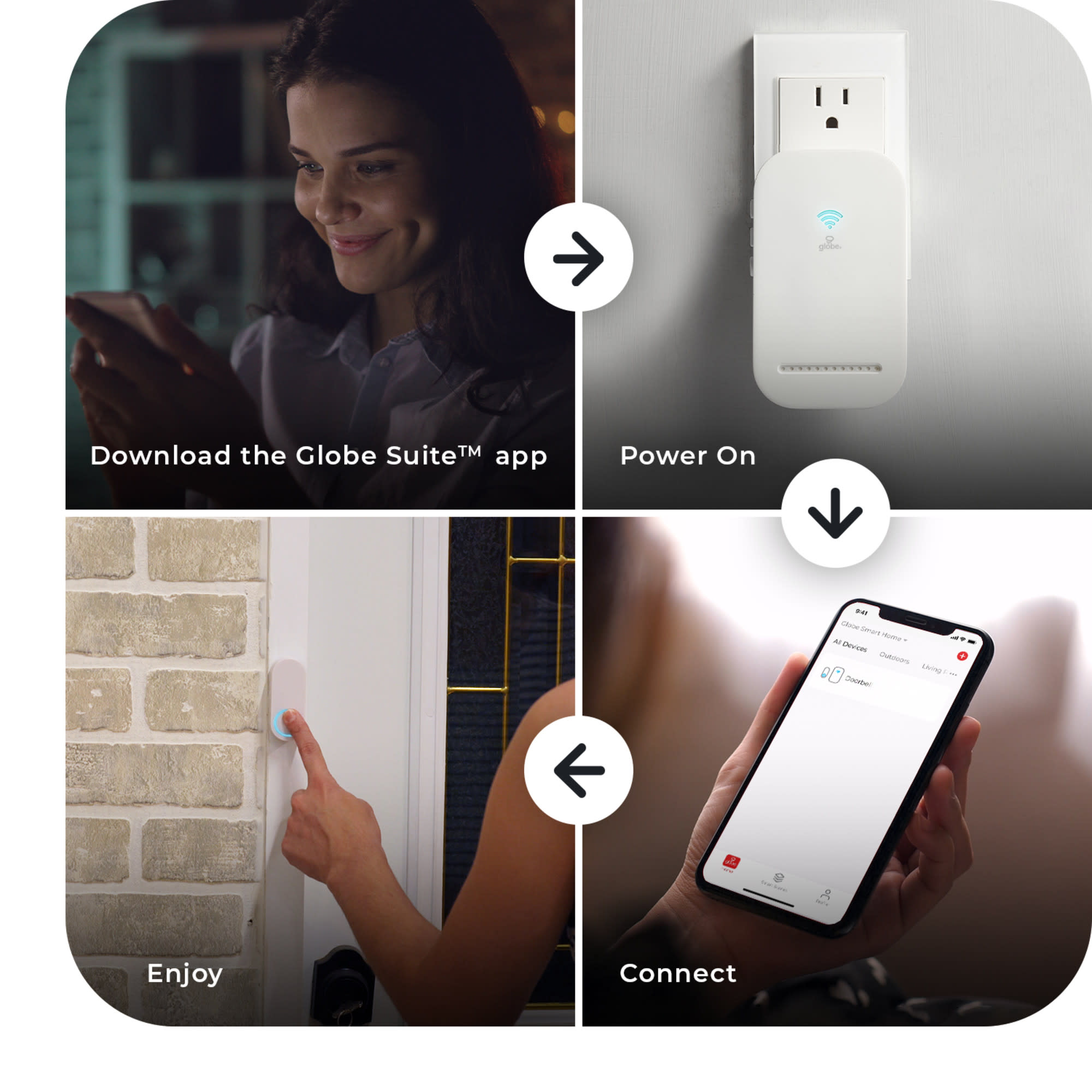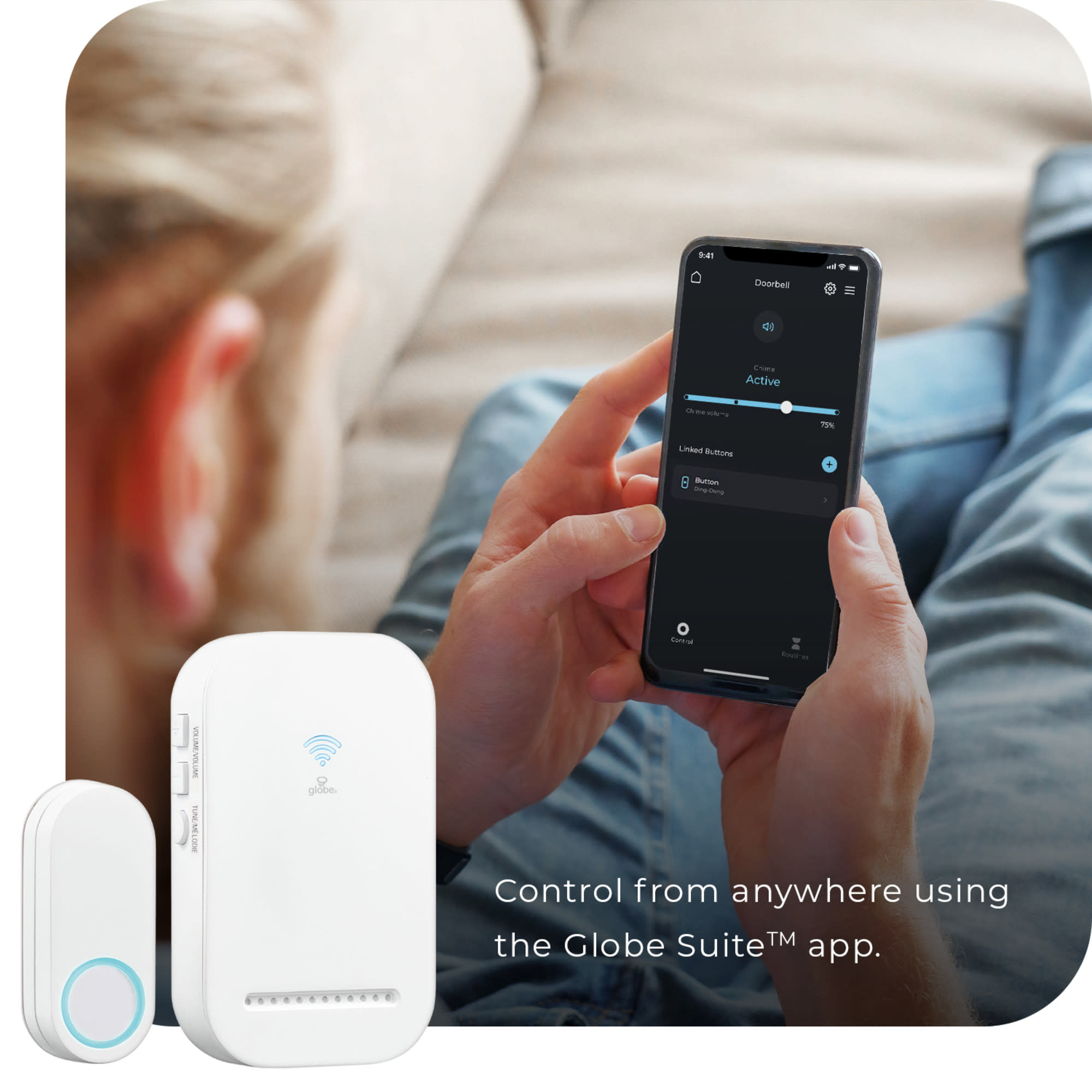Item DescriptionAutomate your home with an app on your phone. It's easy. Simply download the GLOBE SUITE™ App, sync your smart device and get your home automation started. Globe Electric's smart lighted doorbell and chime kit works with your mobile phone to notify when someone is at your door. Whether you're home or away, you'll get notified any time someone rings.. Be there when you're not.