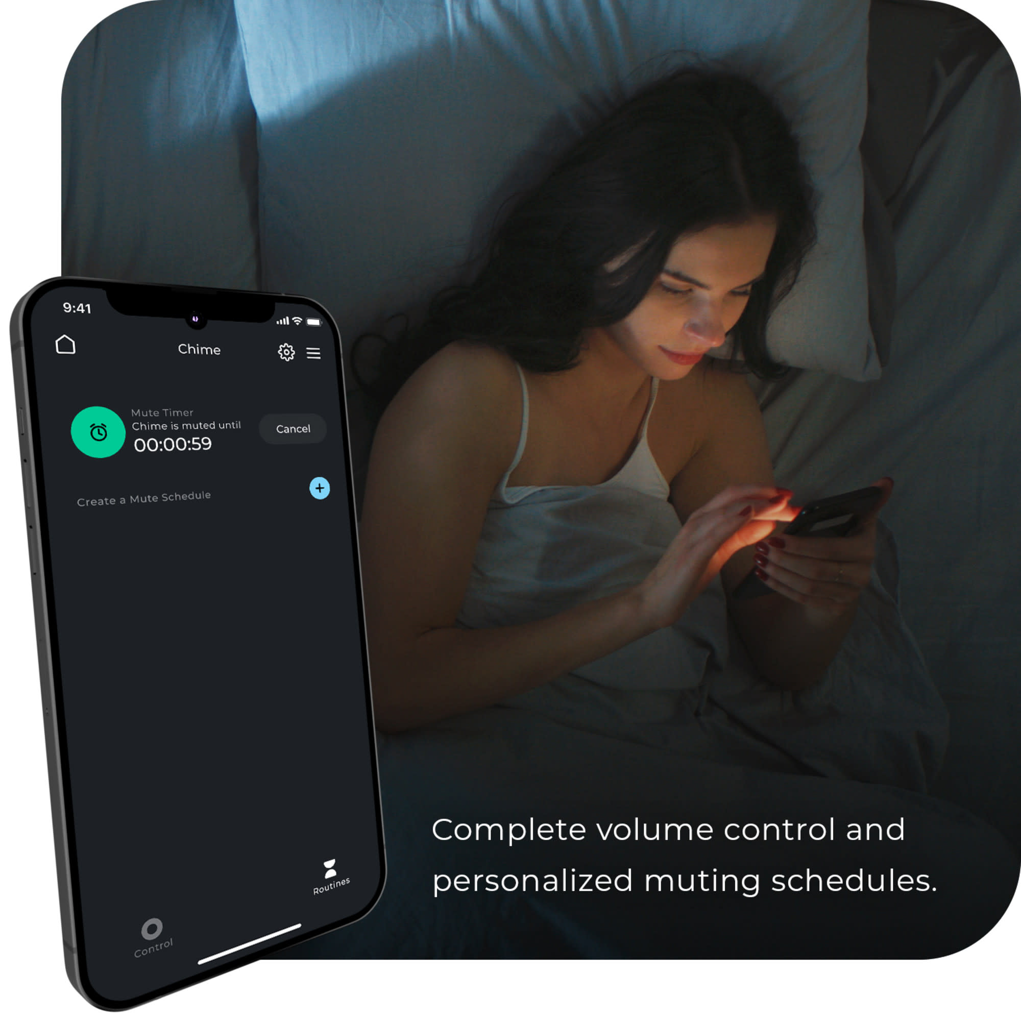 - Use the timer in the app to mute your chime for a select amount of time, or create a routine that will mute the chime at specific times throughout the day, every day.