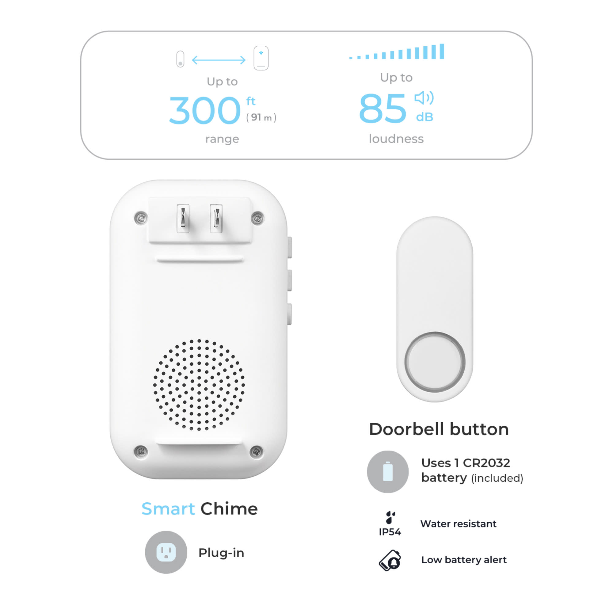 - Chime can be plugged into any standard socket up to 300 feet from your door