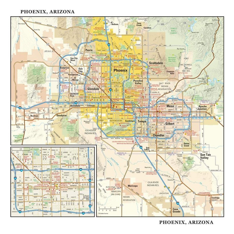 - The highly detailed inset of central Phoenix shows highways, streets, parks, landmarks, and other points of interest. Also available in a small size of 10.625" high X 11.25" wide.
