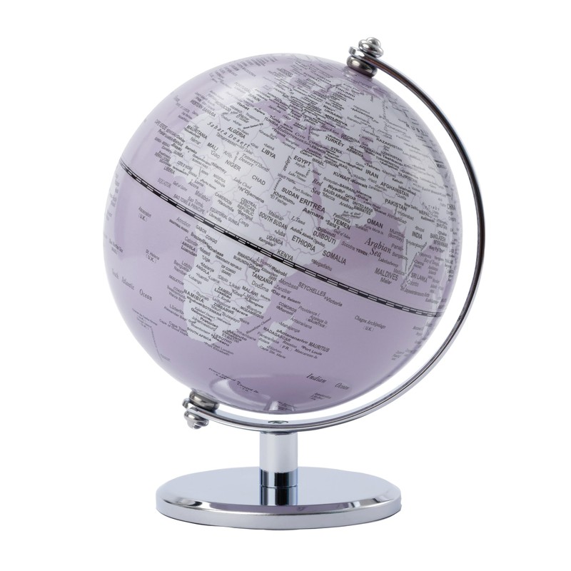 - TROIKA Original globe with 13 cm diameter. High-quality workmanship: mini globe with a handy total height of 17 cm, rotatable on a sturdy chrome-plated metal base. Impressive design and high quality finishes. Felt lined to protect furniture surfaces. GAGARIN GAGARIN GLOBUS GLOBE WITH WHITE COUNTRIES AND LIGHT PURPLE SEAS INSCRIPTION WITH CONTINENTS, OCEANS, COUNTRIES, GEOGRAPHICAL ZONES AND MA