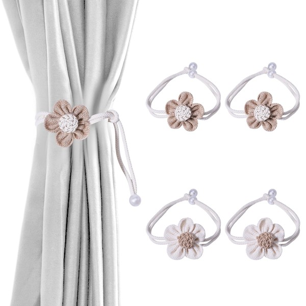 GLOBLELAND 4 Pcs 2 Colors Handmade Knitting Curtain Tie Back Linen Boho Curtain Ties Flower Pearl Curtains Tiebacks Curtain Holdbacks for Home Office Window Draperies