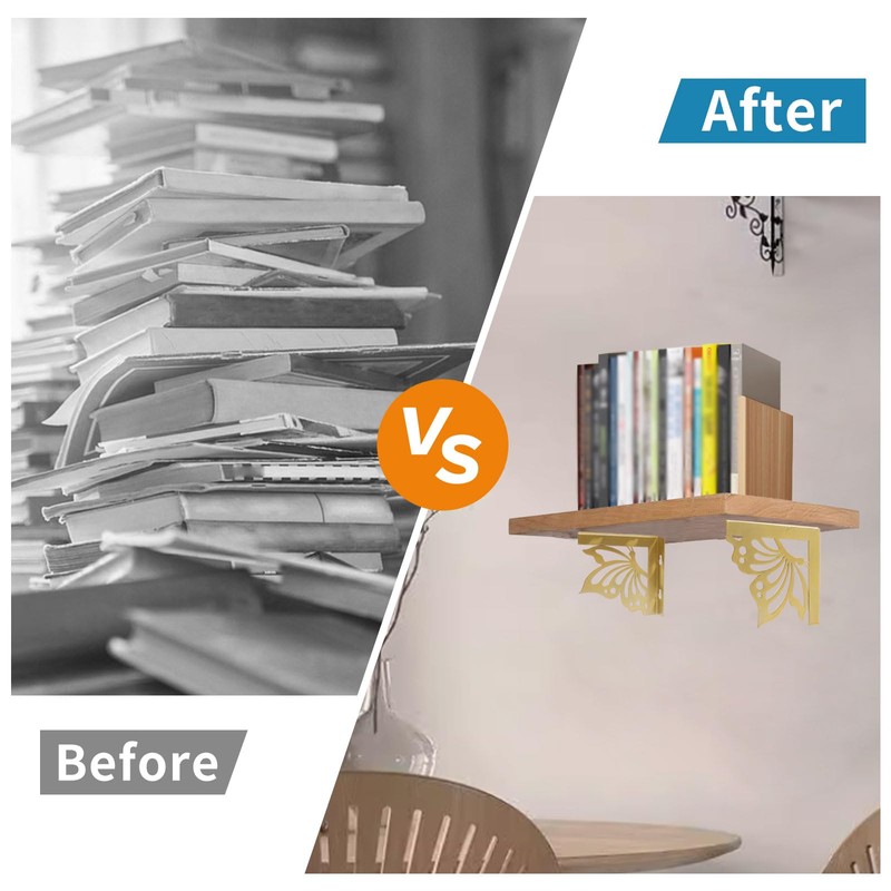- Größe: Goldene Wandregal ist etwa 116mm/4,6 Zoll lang, 116mm/4,6 Zoll hoch, 15mm/0,6 Zoll breit, 1mm/0,04 Zoll dick, 4pcs/set. Fliegende Regalstützen helfen, mehr Wandfläche für die Lagerung oder Ausstellung in jedem Raum zu schaffen und machen es ordentlicher.