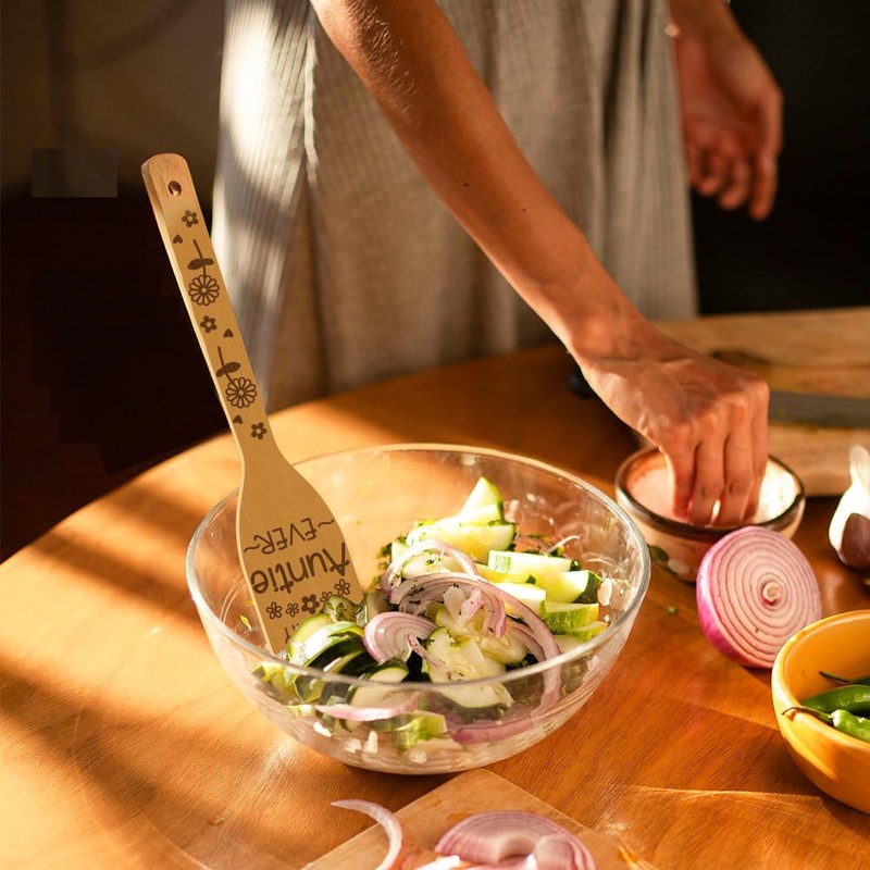 GLOBLELAND 6Pcs Aunt Auntie Wooden Spoons Utensil Set Bamboo Carving Kitchen Cooking Utensils Wooden Engraved Cooking Spatula Set for Kitchen Fun House Warming Gift