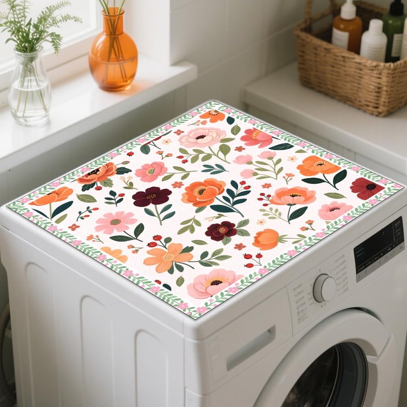 GLOBLELAND Decorative Flowers Washer Dryer Dust Cover 23.6×23.6inch Flowers Leaves Washing Machine Top Protector Pads Non Slip Washing Machine Top Covers for Laundry Room Living Room Desk