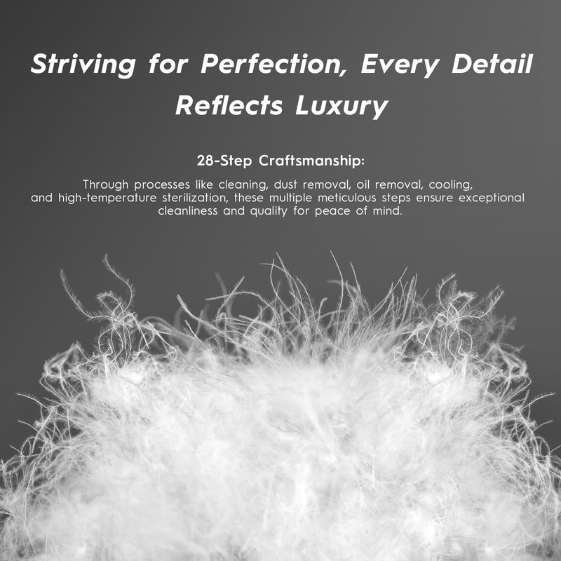 • Ultra Soft: The down filling provide exceptional loft and cloud-like comfort. The natural fluffiness of the high-grade down creates a sumptuous sleeping experience, making it irresistibly soft to the touch—like sinking into a warm, soothing embrace.