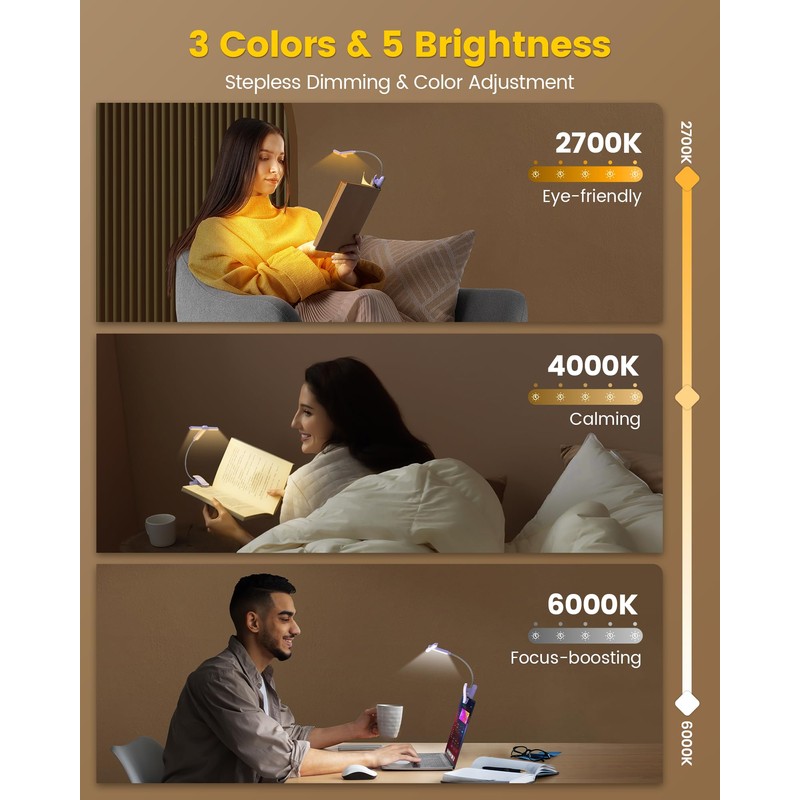 - [?? ???????????? & ?? ????????????????????????] Unsere Tri-Head Buch Leselampe bietet 3 Farbtemperaturen: die sanften 2700.K fr ein beruhigendes Ambiente, die beruhigenden 3400.K und die belebenden 6000.K fr mehr Fokus. Jede Option verfgt ber 5 Helligkeiten, die eine Beleuchtung fr jedes Szenario sicherstellen. Halten Sie die Taste 3 Sekunden lang gedrckt, um Farbe und Helligkeit nahtlos auszuw?hlen. Erh?hen Sie Ihr Leseerlebnis mit dieser au?ergew?hnlichen Leselicht.