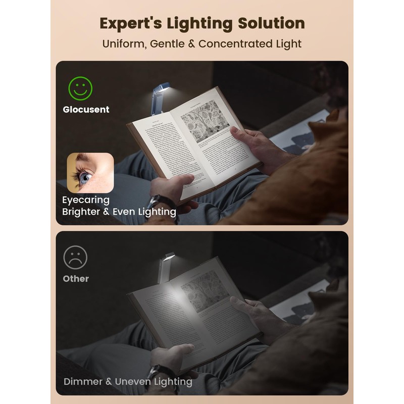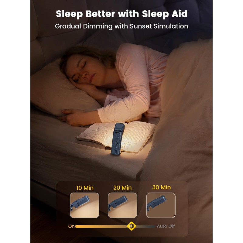 - [Durchdachtes & praktisches Design] Unsere leichte und kompakte Buchleuchte wiegt nur 47g und passt perfekt in jede Tasche. Die intelligente Sperrfunktion verhindert ein versehentliches Einschalten unterwegs. Mit 30- und 45-Minuten-Timern erinnert sie Sie daran, Pausen einzulegen. Die Einschlafhilfe simuliert einen sanften Sonnenuntergang, um Sie allm?hlich in den Schlaf zu begleiten. Die ideale Nachtleselampe fr unterwegs und zuhause.