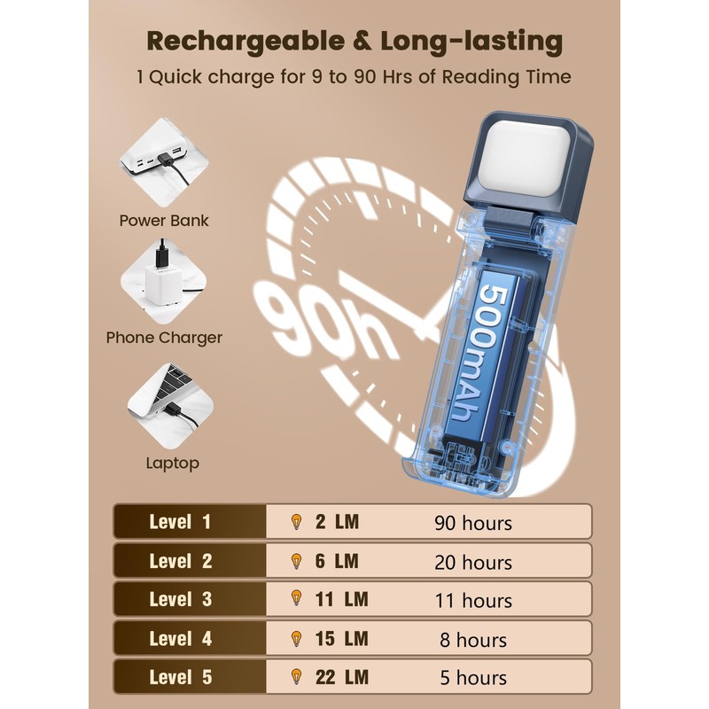 - [Wiederaufladbar & langlebig] Diese Buchleuchte mit 500 mAh-Akku bietet je nach Helligkeit 10C90 Stunden Lesedauer. Bei t?glich 30 Minuten Nutzung h?lt sie bis zu 3 Monate. Der schnelle und sichere USB-C-Anschluss ist mit jedem USB-Ger?t kompatibel. Vier LED-Kontrollleuchten zeigen den Akkustand an, sodass Sie immer informiert sind und ohne Unterbrechungen lesen k?nnen. Eine kraftvolle und zuverl?ssige wiederaufladbare Leselampe.