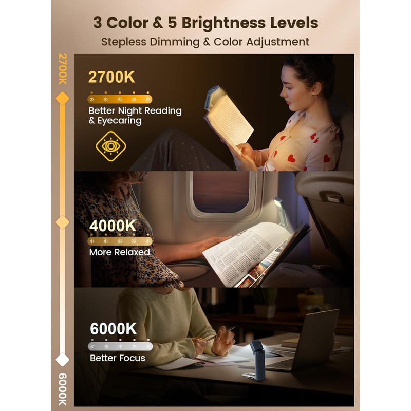 - [3 Farben & stufenlose 5 Helligkeitsstufen] Diese Buchleuchte bietet 3 Farbtemperaturen: 2700K filtert blaues Licht fr optimalen Augenkomfort, 4000K schafft eine gemtliche Atmosph?re fr entspanntes Lesen, und 6000K untersttzt Konzentration C ideal fr Bastelarbeiten und pr?zise Aufgaben. Jede Farbtemperatur hat 5 stufenlose Helligkeitsstufen von 5 bis 25 Lumen. Die perfekte Geschenkidee fr Buchliebhaber.