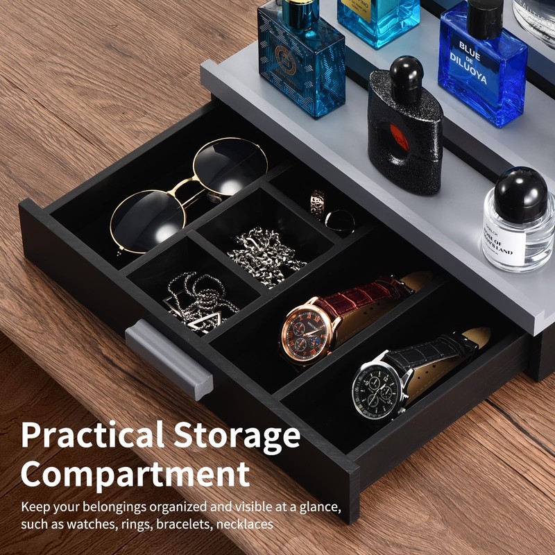 【Practical Hidden Compartment】The perfume holder organizer for the dresser comes with a practical drawer and compartments. The compartments with velvet are available on the bottom and sides to ensure your belongings stay organized and allow you to store shavers, watches, rings, necklaces, valuable jewelry, coins, and other items in it. The base is lined with soft velvet to protect your items from scratches and other damage. Lift the lid up to easily open the hidden compartment at the top.