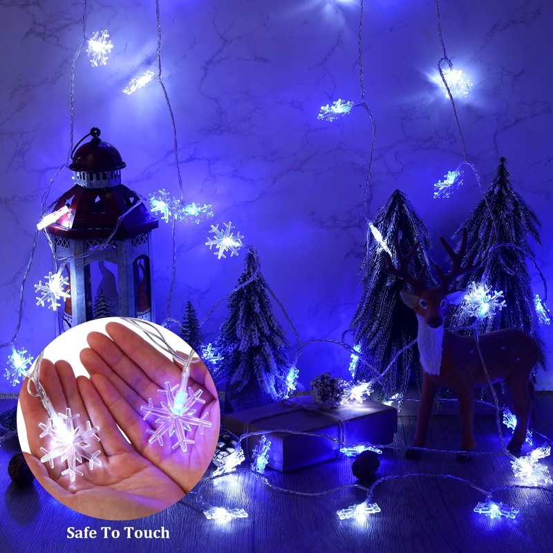 - Snowflakes Design: the battery operated snowflake string lights serve as the light source are colored blue and white, offering a visually rich experience; For even more spectacular visuals, you can match it with other decorations to create a joyful and pleasant atmosphere