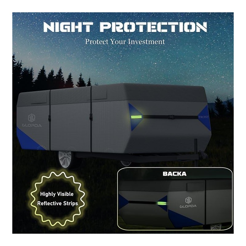 - SUPERIOR UV PROTECTION C Our tent trailer cover is mixed with UV-resistant additives to reduce significantly reducing sun damage and fabric aging, blocking 90% of harmful UV rays. Additionally, the pop up camper cover features reflective strips on the front and back for enhanced visibility and collision prevention at night. This is not just a productit's built to protect, designed for adventure.
