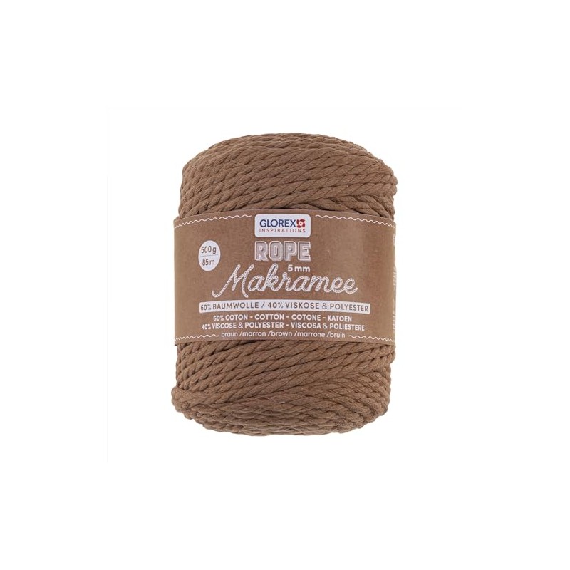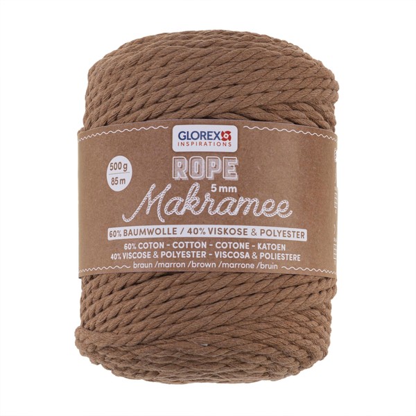 GLOREX 5 1007 21 - Macrame Rope 5 mm, 500 g, Brown, Length 85 m, Super Soft Textile Yarn Made of 60% Cotton, 40% Viscose, for Crocheting, Knitting, Knotting and Textile Designing