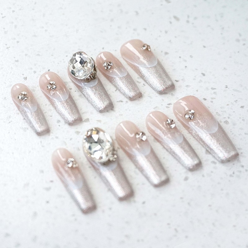 Transform your nails into a stunning masterpiece with these elegant press-on nails featuring a sophisticated long ballerina coffin shape. Each set includes 10 perfectly crafted pieces that combine the timeless appeal of French tips with a modern twist. The nails showcase a dreamy combination of soft nude base and dazzling silver glitter tips, creating a captivating cat-eye effect. What sets these nails apart is the luxurious embellishment of carefully placed rhinestones - featuring both delicate accent stones and statement oval crystals that catch the light beautifully. These salon-quality press-on nails deliver a professional-looking manicure in minutes, perfect for special occasions or everyday glamour. The long-lasting design ensures your manicure stays picture-perfect, while the premium materials provide a natural-looking finish. Each nail is handcrafted with attention to detail, ensuring consistent quality and a flawless appearance. These press-ons offer the perfect balance of sophistication and sparkle, making them ideal for anyone seeking an instant upgrade to their nail game.