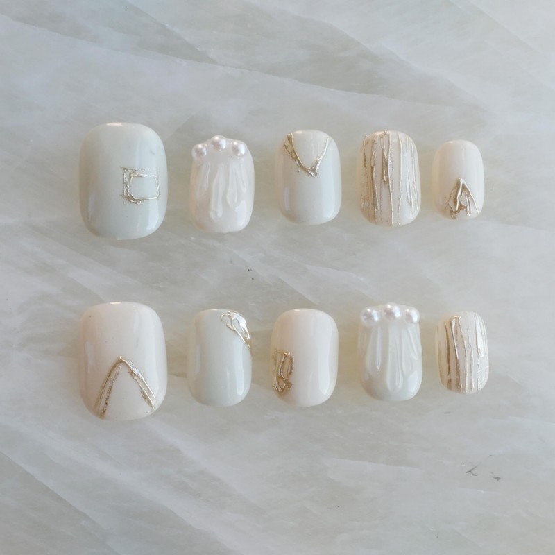- デザイン性: 上品な白とゴールドのシェル模様とパールのアクセントを施した、サロン品質の短いスクエア型ネイル