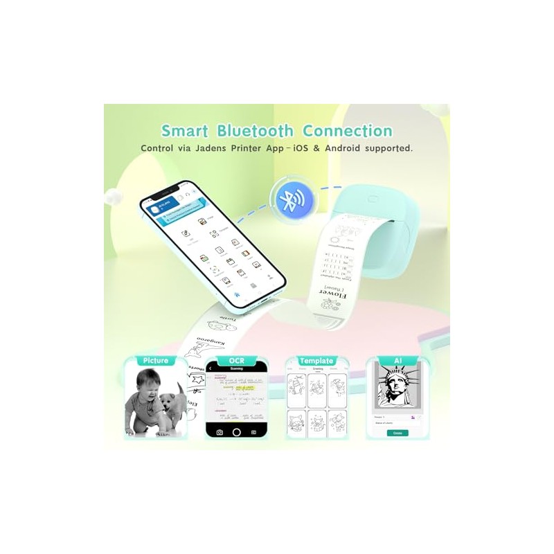- Smart App Control - Easily connect to your iOS or Android device through Bluetooth using the Jadens Printer App. The app provides a rich set of features: document and photo printing, QR code and chart generation, OCR text recognition, drag-to-resize editing, DIY drawings, AI-assisted image printing, and an extensive library of templates.