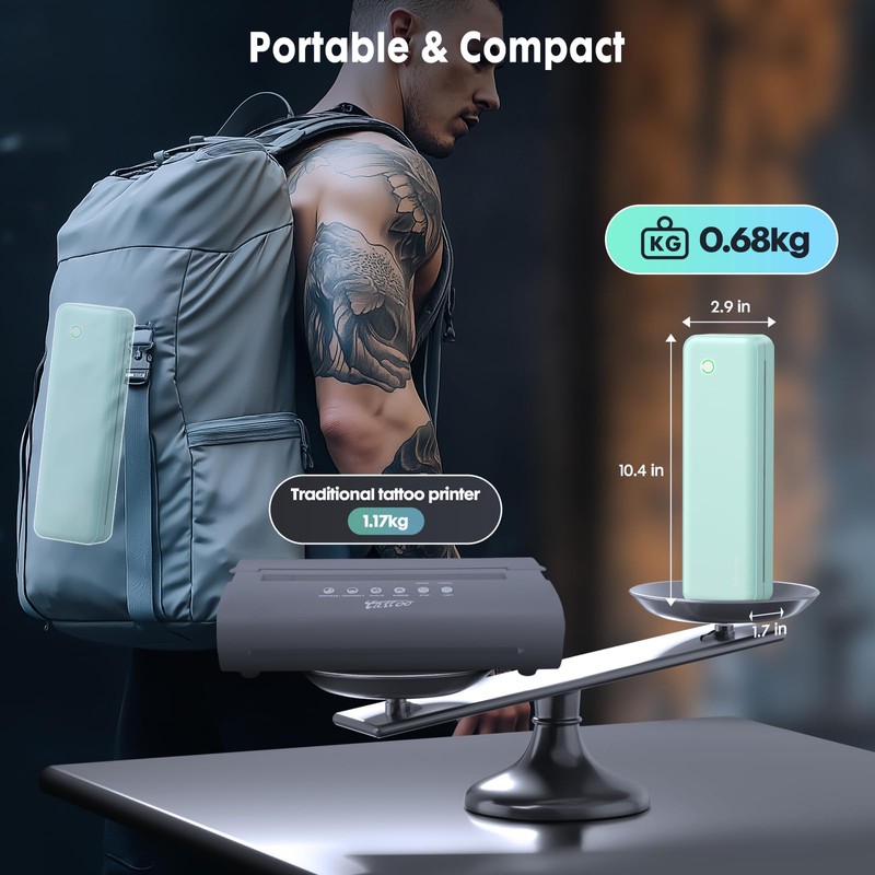 - Portable & Compact - Weighs only 1.5 pounds, much smaller than traditional tattoo transfer machines, offering portability and convenience. Lightweight and compact, this tattoo stencil printer is perfect for both home studios and on-the-go artists. Its portable design makes it easy to take to conventions, guest spots, or client locations.