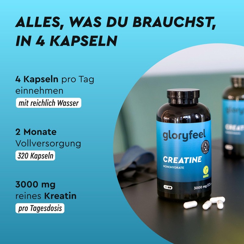 gloryfeel Creatine capsules - 320 capsules for effective strength training * with 3,412 mg creatine monohydrate, including 3,000 mg pure creatine per day - Mesh factor 200, high-dose and carefully laboratory-tested